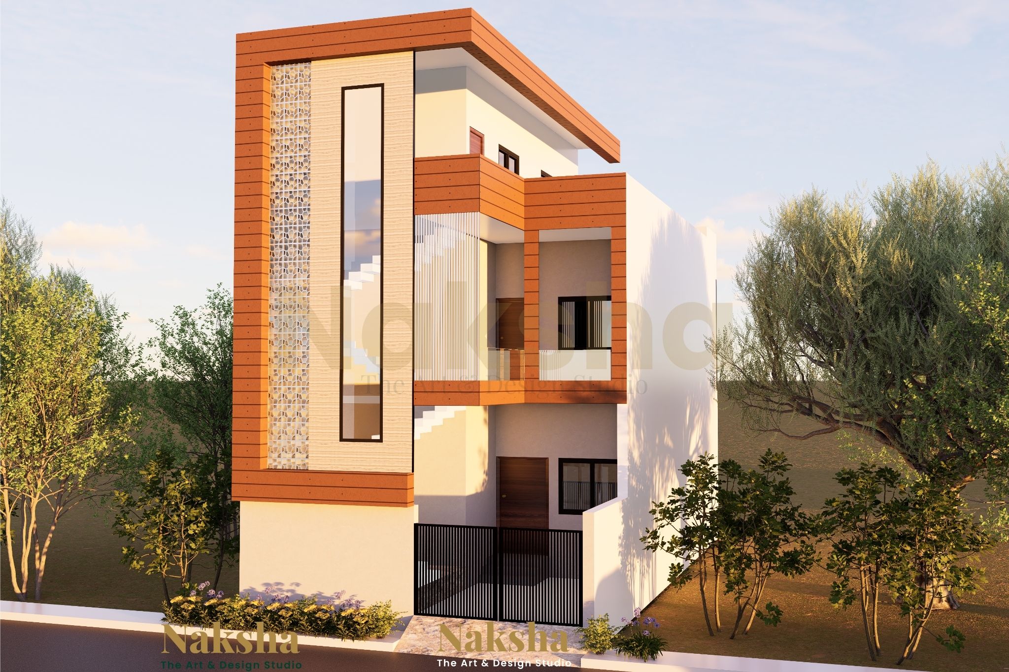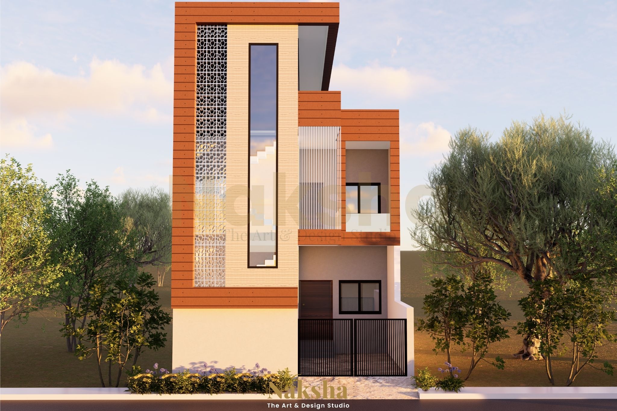 The design for Indragound Residence embodies a sleek, contemporary aesthetic with a focus on functionality and visual harmony. The compact three-storey structure features clean lines and a minimalist façade accented with warm terracotta tones and textured finishes to create a timeless modern appeal. A striking vertical jaali screen becomes the signature element of the elevation, serving as both an artistic feature and a functional device to ensure privacy, filter sunlight, and enhance cross-ventilation.